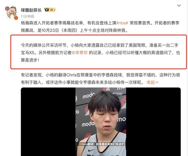 自从杨瀚森来到NBA加入开拓者之后,他在国外的生活就备受很多球迷的关注。因为本身杨瀚森没有过留洋经验,所以他在英语方面是不过关。大家其实挺操心他在国外是否过得好,能不能够住的习惯。不过从最近半年的一系列事情其实能够看得出来,杨瀚森的适应速度还是相当快,甚至比姚明当年还要更快的融入球队和当地的生活。根据最新媒体日透露的消息,杨瀚森在接受采访的时候向外界透露了一个喜讯。他说自己已经成功拿到了美国当地的驾照,而且接下来还准备要选入一台二手的某品牌名车。这一次是小杨自己主动在采访当中透露出来的消息,也就意味着他本人相当开心。毕竟未来几年的时间,杨瀚森估计都会在国外长期居住打球。所以想要更好的通勤,想要更快的融入当地的生活,确实需要考取驾照,然后拥有自己的一台爱车。在这样的情况下,不管是开车去训练馆训练,还是外出吃饭或者娱乐。又或者带上女朋友去看场电影,其实都需要自己的交通工具。对于所有喜欢杨瀚森的球迷来说,看到小杨能够如此速度的融入当地的生活,应该会为他感到由衷的欣慰和开心。说实话,从最近一系列的细节可以感受到,杨瀚森和球队的队友相处还是相当愉快,而且教练组也很喜欢这名年轻球员,他本人的性格也比较活泼外向,很懂得自得其乐,这其实是非常难得的性格。再加上杨瀚森本身也具备一定的天赋,也愿意吃苦努力,我们相信他肯定可以在NBA闯出一片天。至于近来外界的各种争议,实际上杨瀚森完全不必理会,因为他是一名20岁的年轻球员,刚刚来到NBA这种顶级篮球的联赛殿堂,换做是任何一名球员恐怕都不会适应。所以对于杨瀚森本人来说,只需要埋头苦干,将来用成绩证明自己就可以了。从之前季前赛外界的评论来看,很多国外的网友甚至比我们国内的球迷都还要宽容。因为他们知道一名年轻的新秀成为一名球星,其实是需要时间去提升去磨练的。而我们很多根本不看球的球迷,只想着杨瀚森一夜之间成为NBA全明星的巨星,这显然是非常不现实的。所以我们希望杨瀚森一步一步来,先融入当地的生活,适应当地的环境,然后开始升级打怪。总有一天他会用他的成绩向外界证明,他就是姚明之后中国男篮的另外一个顶梁柱。