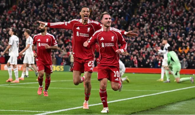 第61分钟,利物浦任意球进攻,索博斯洛伊将球传到了门前,麦卡利斯特前点头球顶进,帮助利物浦1-0打破僵局,现场超过五万球迷瞬间沸腾了。