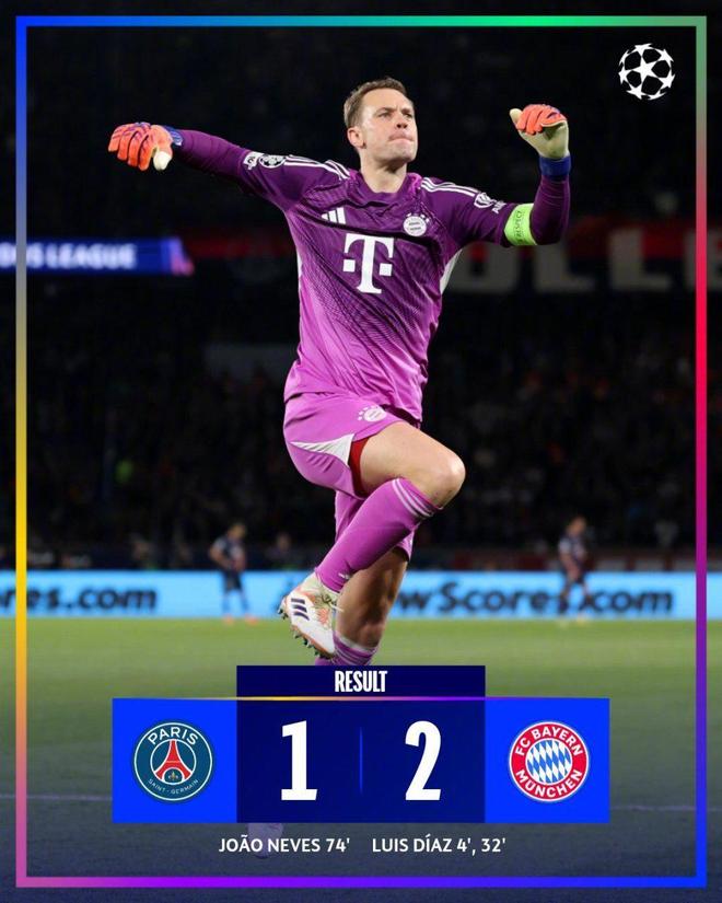 巴黎圣日耳曼1-2拜仁慕尼黑开场仅仅4分钟迪亚斯补射破门,拜仁1-0取得梦幻开局。第32分钟迪亚斯前场抢断后突入禁区推射破门,拜仁2-0扩大了领先优势。半场补时阶段,迪亚斯凶狠犯规被红牌罚下。第74分钟若昂-内维斯门前包抄破门,帮助大巴黎扳回1球。利物浦1-0皇家马德里全场比赛唯一进球出现在第61分钟,索博斯洛伊将球传到禁区内,麦卡利斯特抢点头球攻门得手,利物浦队1-0取得领先。布拉格斯拉维亚0-3阿森纳第32分钟阿森纳获得点球机会,萨卡主罚一蹴而就,帮助球队1-0取得领先。第46分钟梅里诺接到队友传中,门前包抄垫射破门,阿森纳扩大领先优势。第68分钟梅里诺回头望月梅开二度,阿森纳将比分定格在3-0。