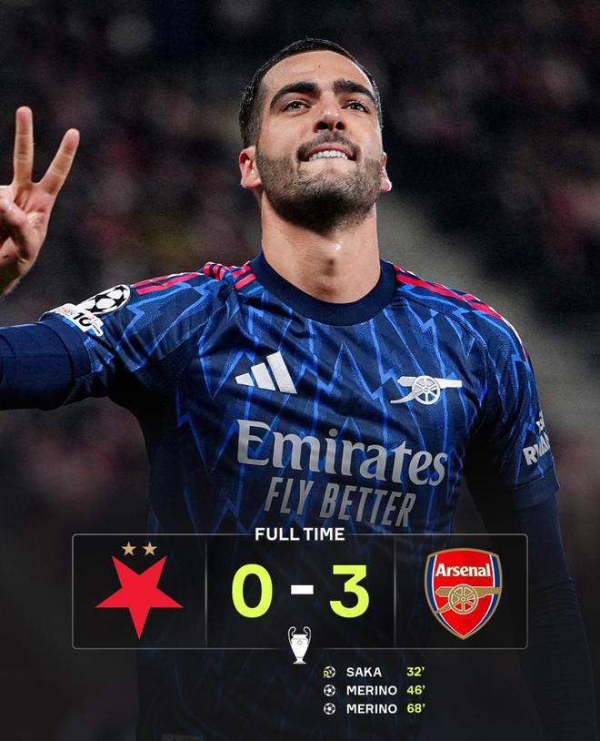 本赛季的阿森纳,表现真的是越来越出色,少帅看来要砸掉千年老二的名号啦!本赛季欧冠小组赛第4轮,阿森纳客场挑战布拉格斯拉维亚。此役,枪手虽然是伤兵满营,但是阿尔特塔帐下的替补阵容也是相当豪横,不知比主队高出几个级别,这就是超级豪门的底蕴,全身而退问题不大。阿森纳本赛季开局就像被装上了法拉利发动机,赛前他们已经豪取各项赛事九连胜,并连续七场零封对手。欧冠前三场全胜、0失球,更是与国际米兰成为本赛季欧冠“唯一的零失球组合”。另外,阿森纳本赛季16场正式比赛只丢3球!英超丢3球(对利物浦、曼城、纽卡斯尔),杯赛6场全部零封,阿尔特塔的枪手生涯首冠看来是有戏啦。比赛从一开始,强大的阿森纳就没有太多试探,直接上来就主动发起总攻,攻势一浪高过一浪,主队布拉格斯拉维亚只能龟缩防守,找机会打反击战,第20分钟,萨卡切入内侧后突然起脚,险些打破僵局。第32分钟,场上僵局被打破:普罗沃德禁区内手球送点,萨卡主罚命中,阿森纳1-0领先,萨卡成为阿森纳欧冠改制后首位连续四场客场破门的球员。易边再战,仅仅开打35秒,特罗萨德在左路轻盈摆脱后送出传中,中路插上的梅里诺无人盯防,面对门将轻松推射入网,阿森纳将比分扩大到了2-0,这可把场边的阿尔特塔乐开了花。这不仅是本赛季阿森纳最快进球,更是球队欧冠历史上下半场最快入球纪录。第68分钟,斯拉维亚门将马尔科维奇出现低级失误,皮球直接被梅里诺断下,后者推射空门得手,阿森纳3-0遥遥领先;梅里诺梅开二度,枪手基本锁定胜局,最终比分也定格在此,本场枪手获胜手,创下了几大纪录:其一,欧冠前四战全胜+全零封,英格兰史上仅第二队,上一次英格兰球队做到这点,还是 1969-70 赛季的利兹联。55年后,阿森纳成为欧冠改制后的第一支英超球队,阿尔特塔的恩帅瓜迪奥拉都未曾做到过。其二,梅里诺35秒闪击,改写队史欧冠纪录,他的进球刷新了阿森纳在欧冠中下半场最快进球纪录。其三,防守强到离谱,杯赛6场全零封,枪手已经连续8场零封、十连胜,防线稳如铁壁,前16场正式比赛只丢3球,这数据放眼全欧洲都属于变态级别,拜仁的16连胜都比不了啊。