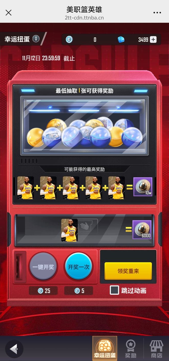 让我们一同期待,湖人下一次主场詹姆斯能否提前复出吧~NBA英雄2最新活动幸运扭蛋来袭扭出五张一样的扑克牌就有铂金招募券!不同的搭配组合还有各种丰富大奖!不管是图一乐还是博大奖,都值得一试!