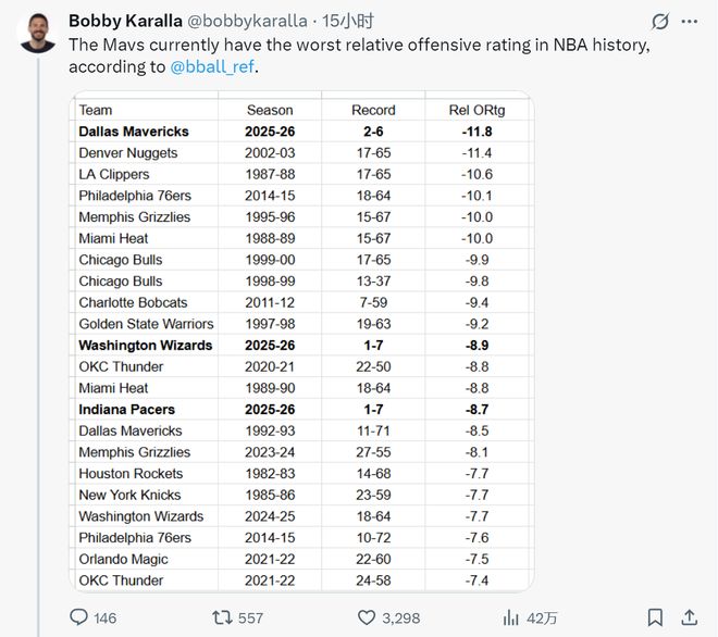 教主简单介绍一下“相对进攻效率”:该球队的进攻效率-那个赛季联盟的平均进攻效率。也就是说,独行侠本赛季每百回合得分,比联盟平均要少11.8分。快船记者Farbod Esnaashari转发评论:独行侠居然比1988年的快船更差,这绝非易事。