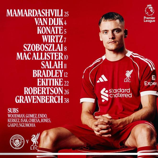 曼城首发:25-多纳鲁马、27-马特乌斯-努内斯、3-鲁本-迪亚斯、24-格瓦迪奥尔、33-尼科-奥赖利、14-尼科-冈萨雷斯、47-福登、20-伯纳多-席尔瓦、10-谢尔基、11-多库、9-哈兰德替补:1-特拉福德、4-赖因德斯、5-斯通斯、6-阿克、7-马尔穆什、21-艾特-努里、26-萨维尼奥、52-奥斯卡-鲍勃、82-里科-刘易斯利物浦首发:25-马马尔达什维利、26-罗伯逊、4-范戴克、5-科纳特、12-康纳-布拉德利、10-麦卡利斯特、38-赫拉芬贝赫、8-索博斯洛伊、11-萨拉赫、7-维尔茨、22-埃基蒂克替补:28-伍德曼、2-乔-戈麦斯、3-远藤航、6-凯尔凯兹、9-伊萨克、14-费代里科-基耶萨、17-柯蒂斯-琼斯、18-加克波、73-恩古莫哈