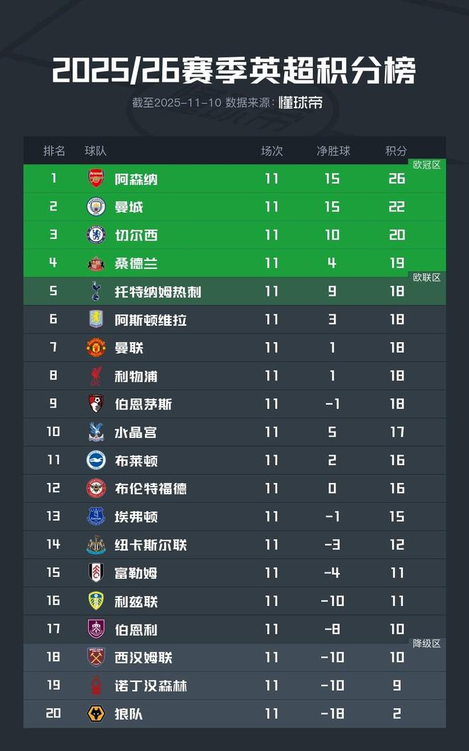 领头羊阿森纳在客场被桑德兰2-2逼平之后放缓了前进脚步,但仍然以4分的优势领跑积分榜。曼城和切尔西都在本轮取得3-0的完胜,从而排在第2和第3位。升班马桑德兰延续着他们令人惊叹的表现,补时绝平阿森纳之后以19分位列第4。托特纳姆热刺、阿斯顿维拉、曼联、利物浦和伯恩茅斯同积18分,依次排在积分榜第5至第9位,17分的水晶宫则位列第10。布莱顿和布伦特福德都得到了16分,分别排在第11和第12,15分的埃弗顿则是处在第13的位置。仅拿到12分的纽卡斯尔联目前排在第14,同样有11分的富勒姆和利兹联分列第15和第16。伯恩利和西汉姆联都只有10分,其中后者已经位列降级区,9分的诺丁汉森林排在倒数第二,只有2分的狼队则毫无悬念地垫底。【上咪咕独家看英超】