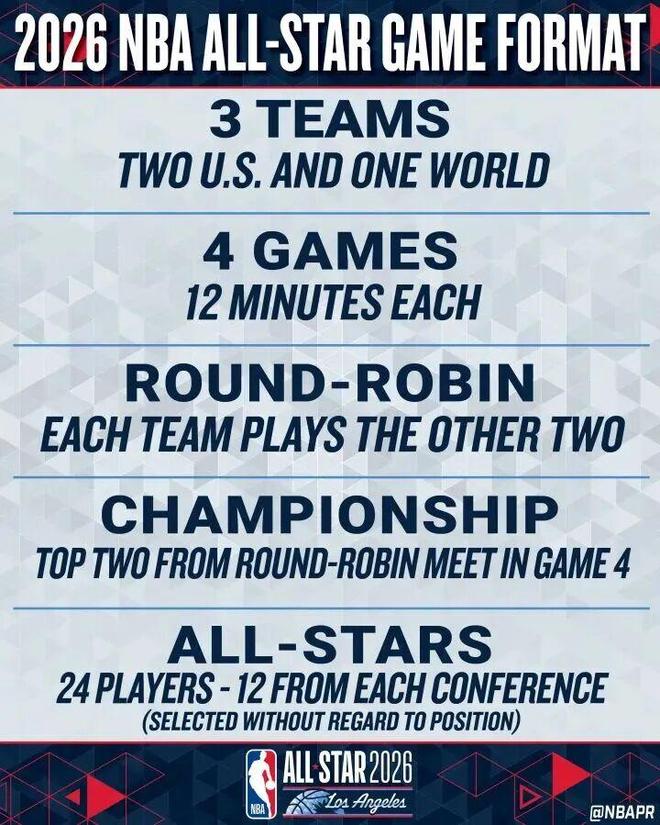 不得不说这样的赛制的确很有噱头届时两支由美国球员组成的球队(美国队)和一支由国际球员组成的球队(世界队)将以循环赛制进行竞争,共包括四场 12 分钟的比赛。这三支球队每队至少将有八名球员。