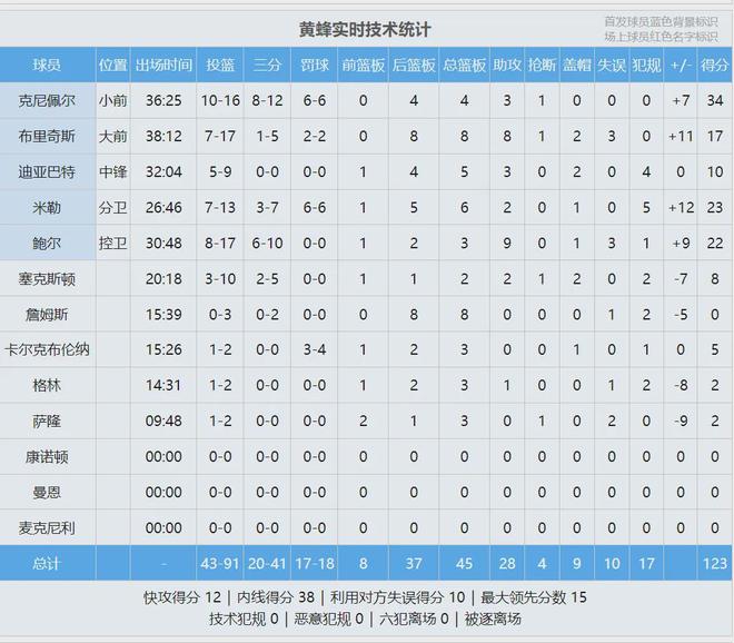 克尼佩尔前9次三分出手进了8个,让人看到了巅峰克莱的影子。让人意外的是,黄蜂赛后发布的获胜海报,居然只有三球一个人。此役三球17中8,得到22分3板9助3失误。米勒13中7,砍下23分6板2助。最近7场,黄蜂6胜1负。