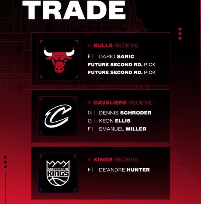 • 公牛得到:达里奥-萨里奇、2027年次轮签、2029年次轮签。