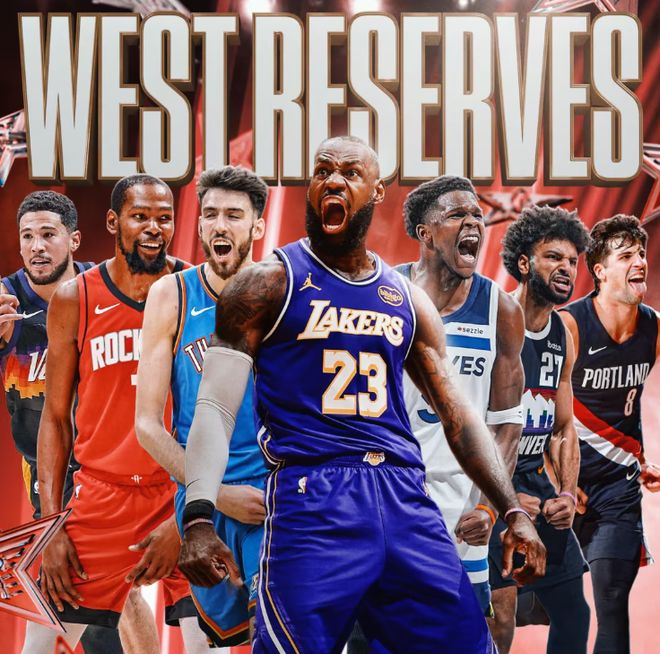 • 替补(7人):詹姆斯(湖人)、杜兰特(火箭)、爱德华兹(森林狼)、德文·布克(太阳)、切特·霍姆格伦(雷霆)、贾马尔·穆雷(掘金)和阿夫迪亚(开拓者)。