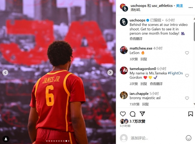 其中,布朗尼-詹姆斯身穿6号球衣,并且他球衣背后的名字是小詹姆斯(James JR),他的全名本为LeBron Raymone James Jr,而我们通常见到的名字都是Bronny James。